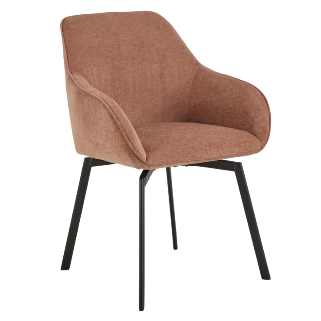 Crafted with premium upholstery that withstands daily use while maintaining its aesthetic appeal, this chair features a robust black steel frame equipped with 180° swivel functionality.