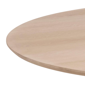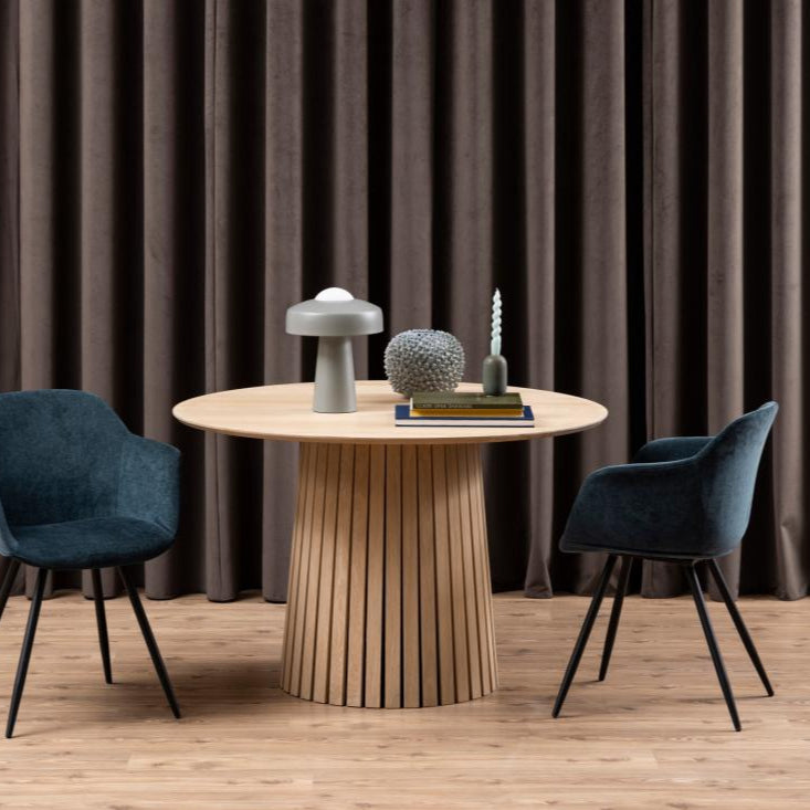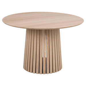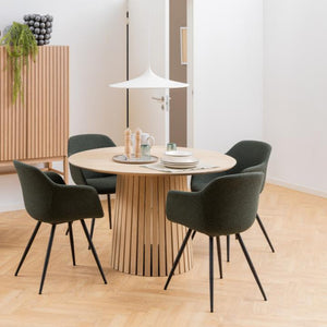 The circular 110 cm tabletop comfortably seats four, making it ideal for intimate gatherings. Constructed from durable MDF with a soft, natural aesthetic, this piece combines visual sophistication with practical longevity.