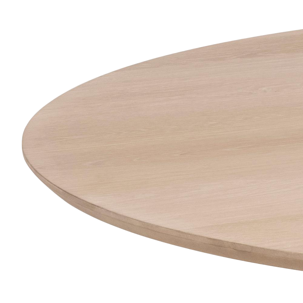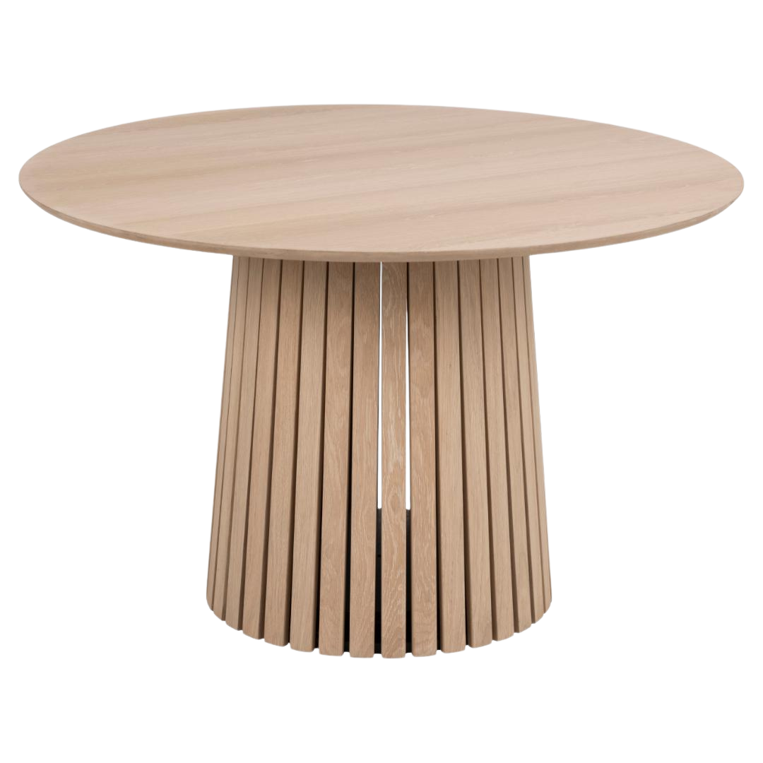 The ELOWEN dining table embodies the serene elegance of Scandinavian craftsmanship. Its warm oak veneer finish and thoughtfully curved silhouette create a refined focal point, while the sculptural slatted base with tapered legs adds architectural interest.