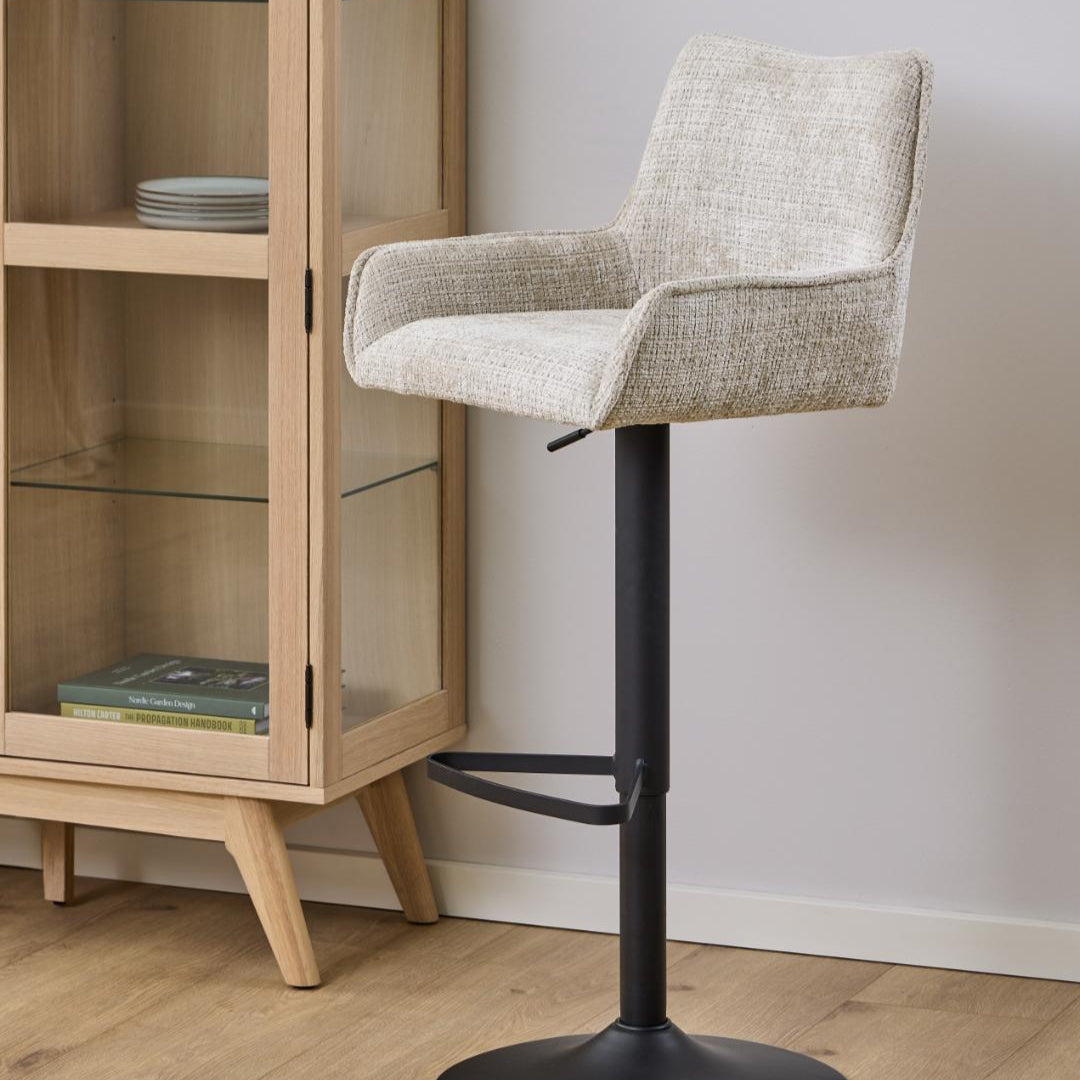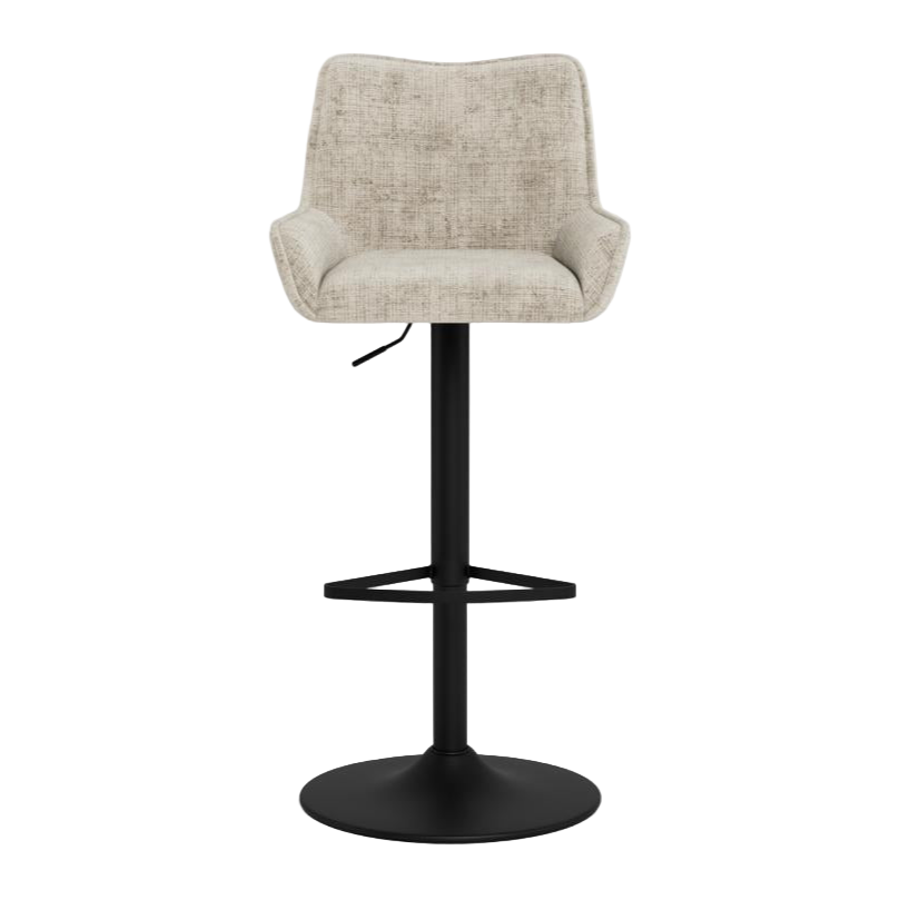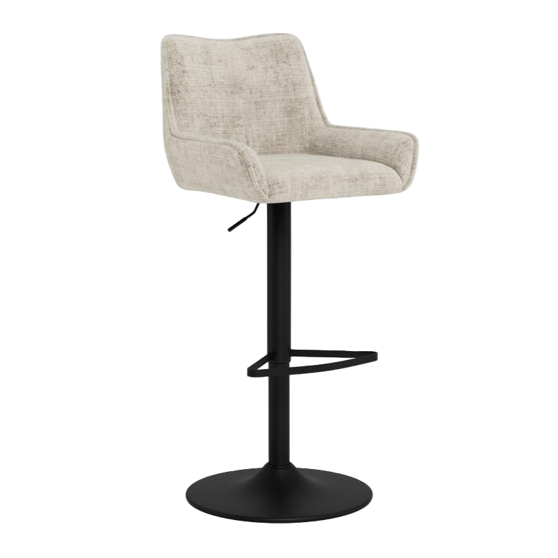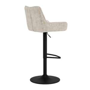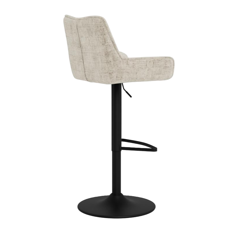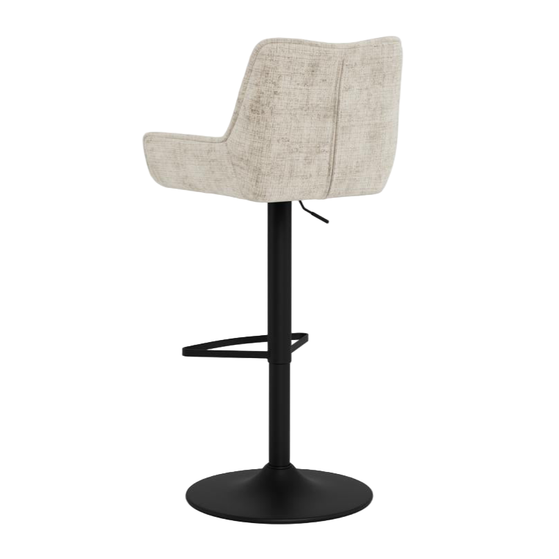 The pneumatic gas-lift mechanism enables effortless height adjustment, accommodating various counter and bar configurations with precision. A sturdy black base anchored by a footrest ensures stability and ergonomic support during extended use.