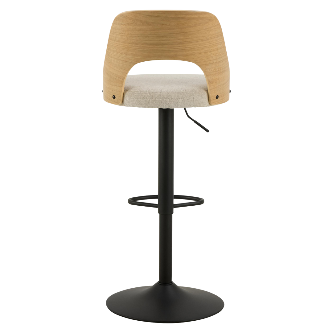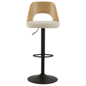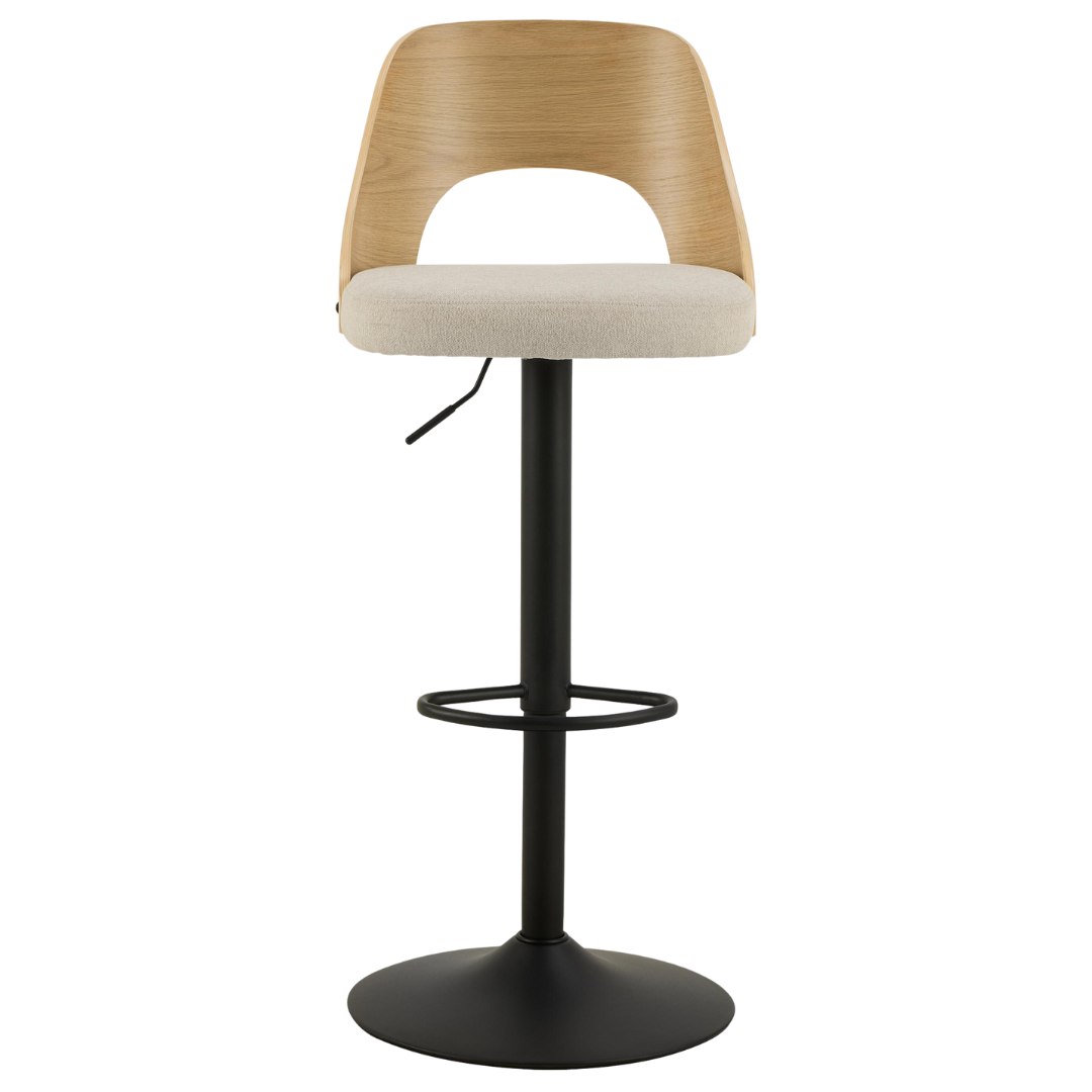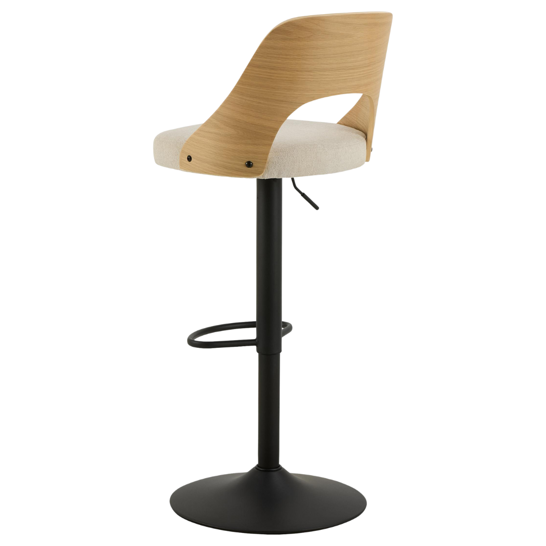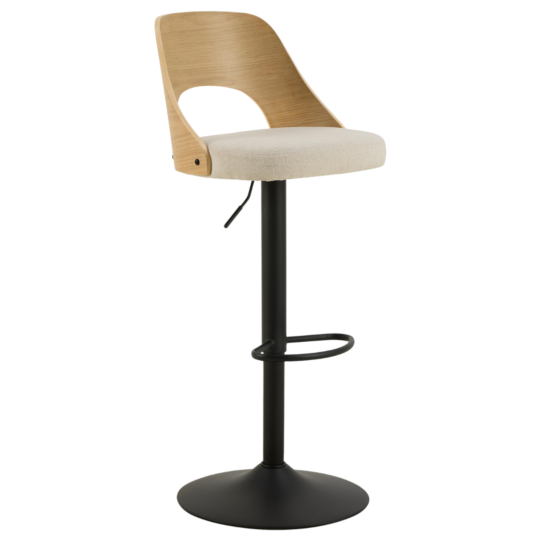 The ORENKA bar stool merges Scandinavian design principles with contemporary practicality. This refined seating solution features an oak veneer backrest that delivers enduring visual appeal, paired with a plush beige chenille seat for superior comfort.