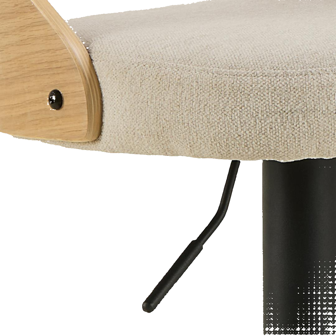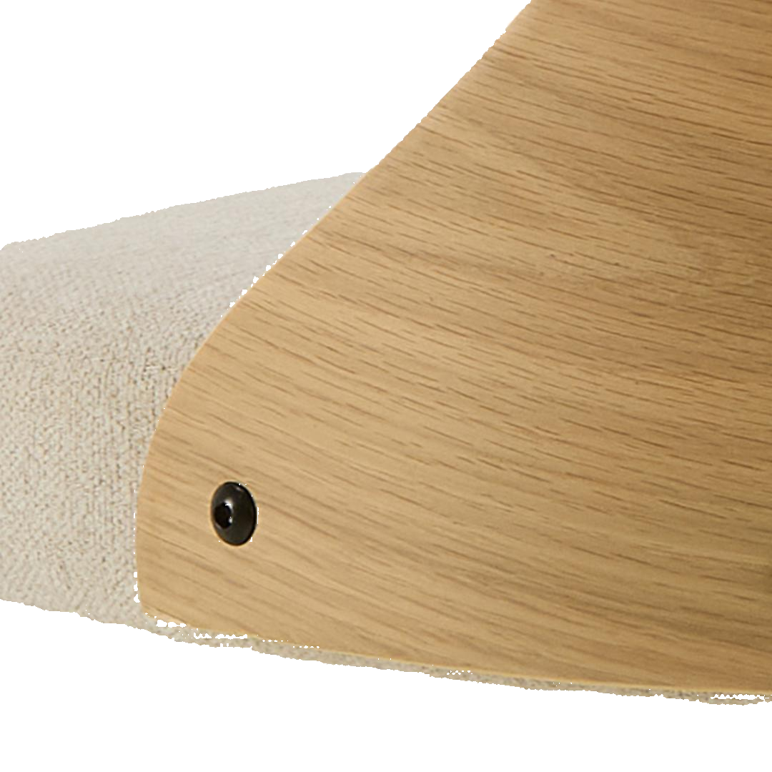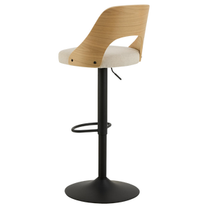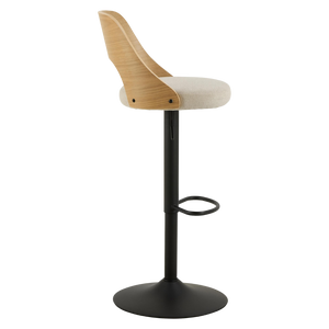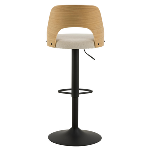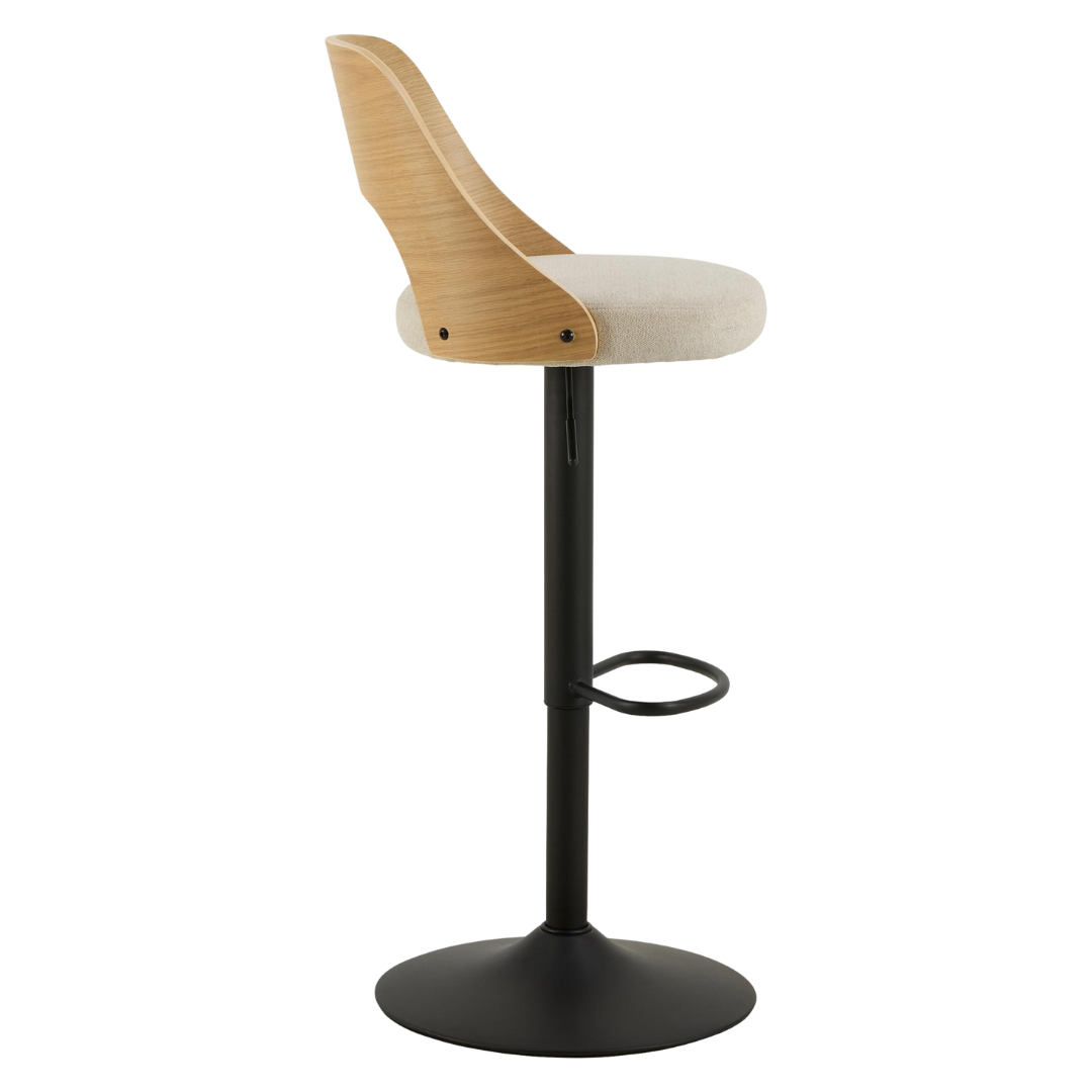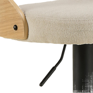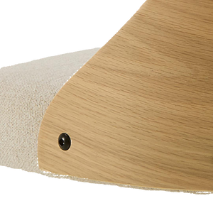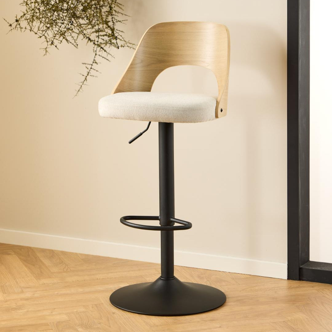 The ORENKA bar stool merges Scandinavian design principles with contemporary practicality. This refined seating solution features an oak veneer backrest that delivers enduring visual appeal, paired with a plush beige chenille seat for superior comfort.