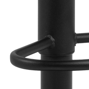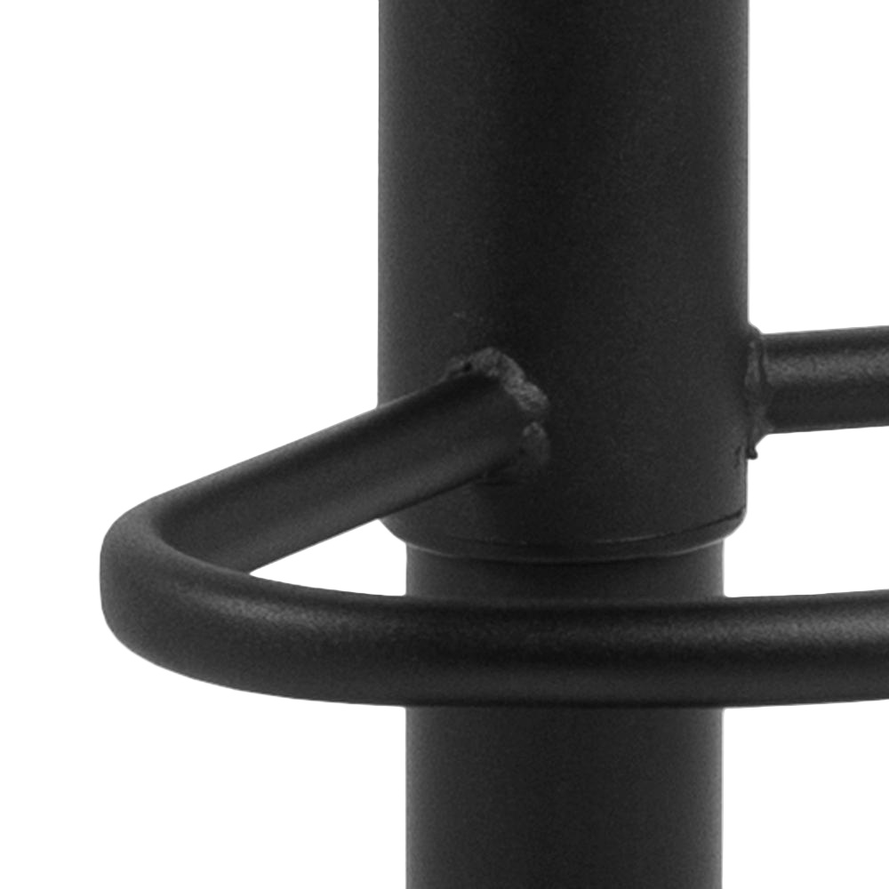 The rotating black metal base ensures stability while maintaining a minimalist aesthetic. Height adjustment and integrated footrest provide ergonomic support for extended use.