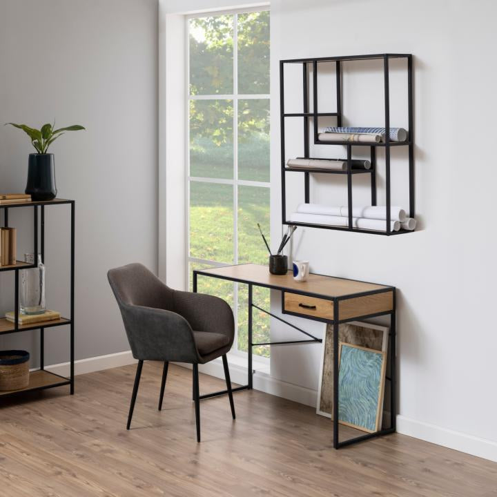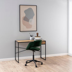 The Orion desk merges industrial aesthetics with contemporary functionality, engineered for professionals who demand both performance and design integrity. Its robust powder-coated steel framework establishes a commanding presence while the warm wood-grain surface introduces organic visual relief and tactile warmth.