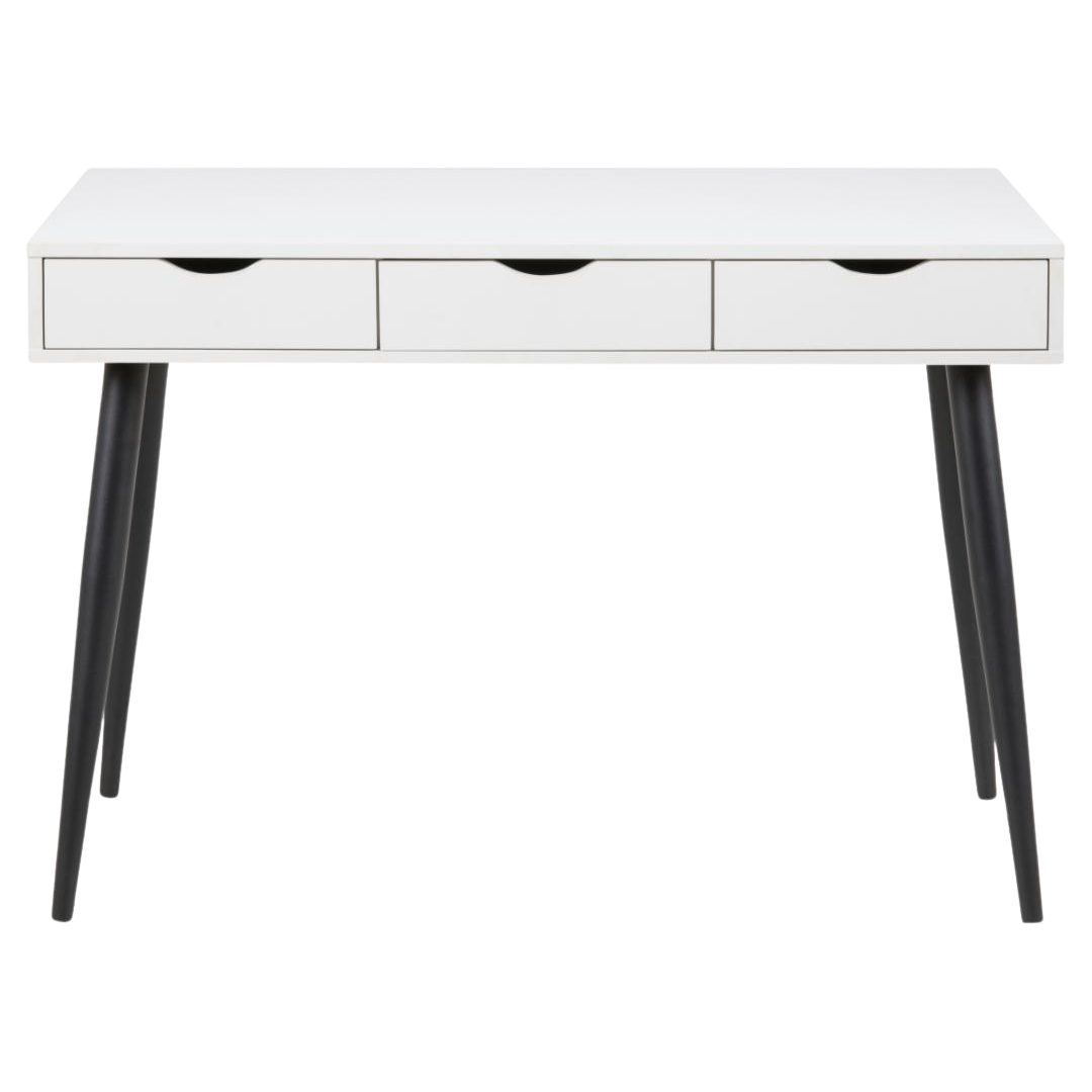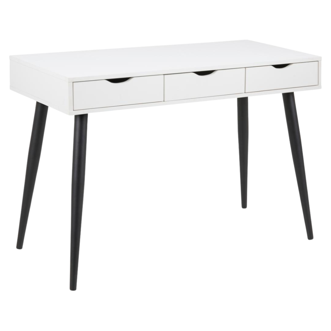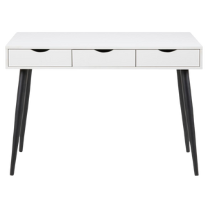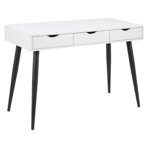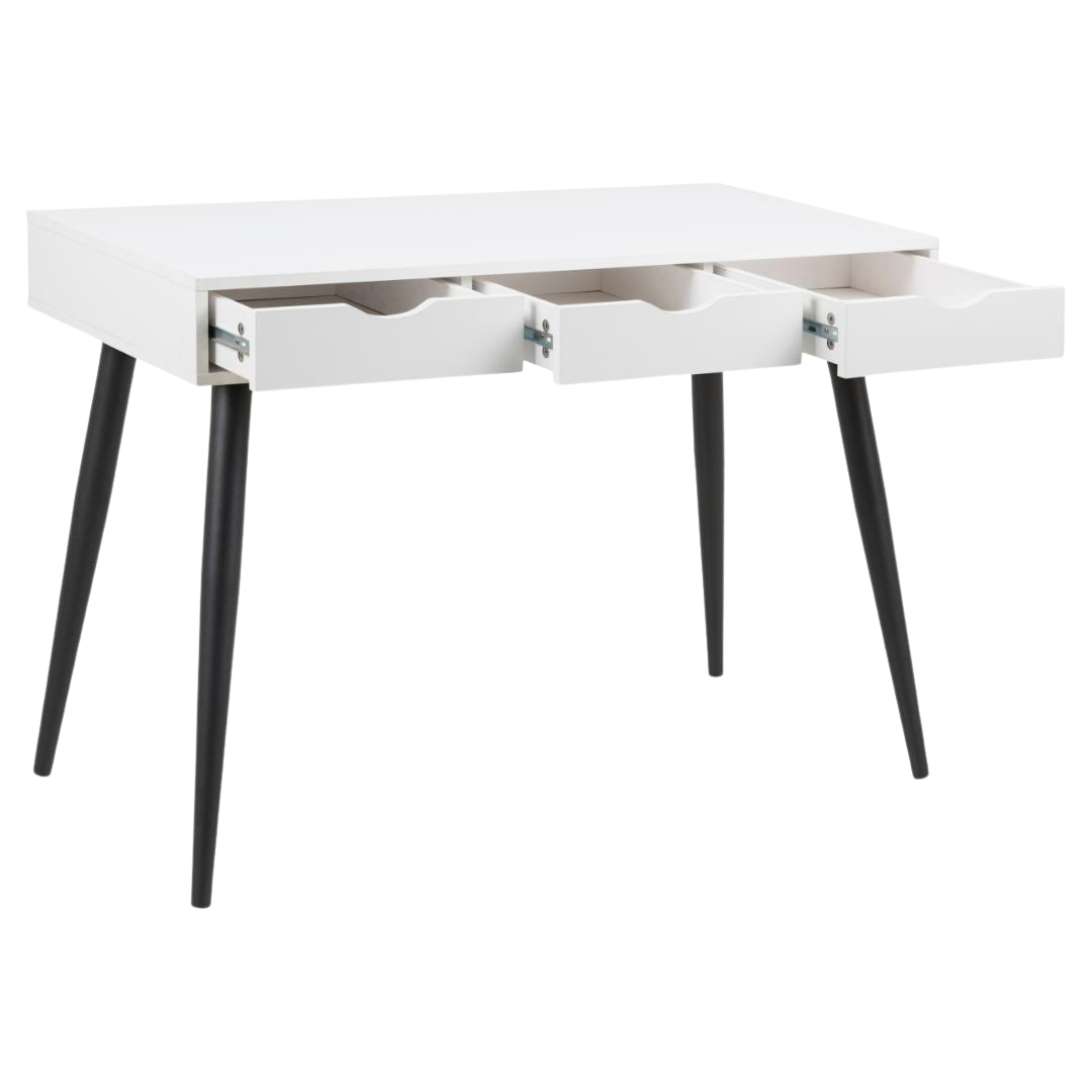 The Sento desk represents the pinnacle of minimalist workspace design, featuring a clean white work surface anchored by a sophisticated black steel framework. Three generously proportioned drawers provide intelligent storage solutions for computing devices, documentation, and professional accessories, maintaining an organized and distraction-free environment.