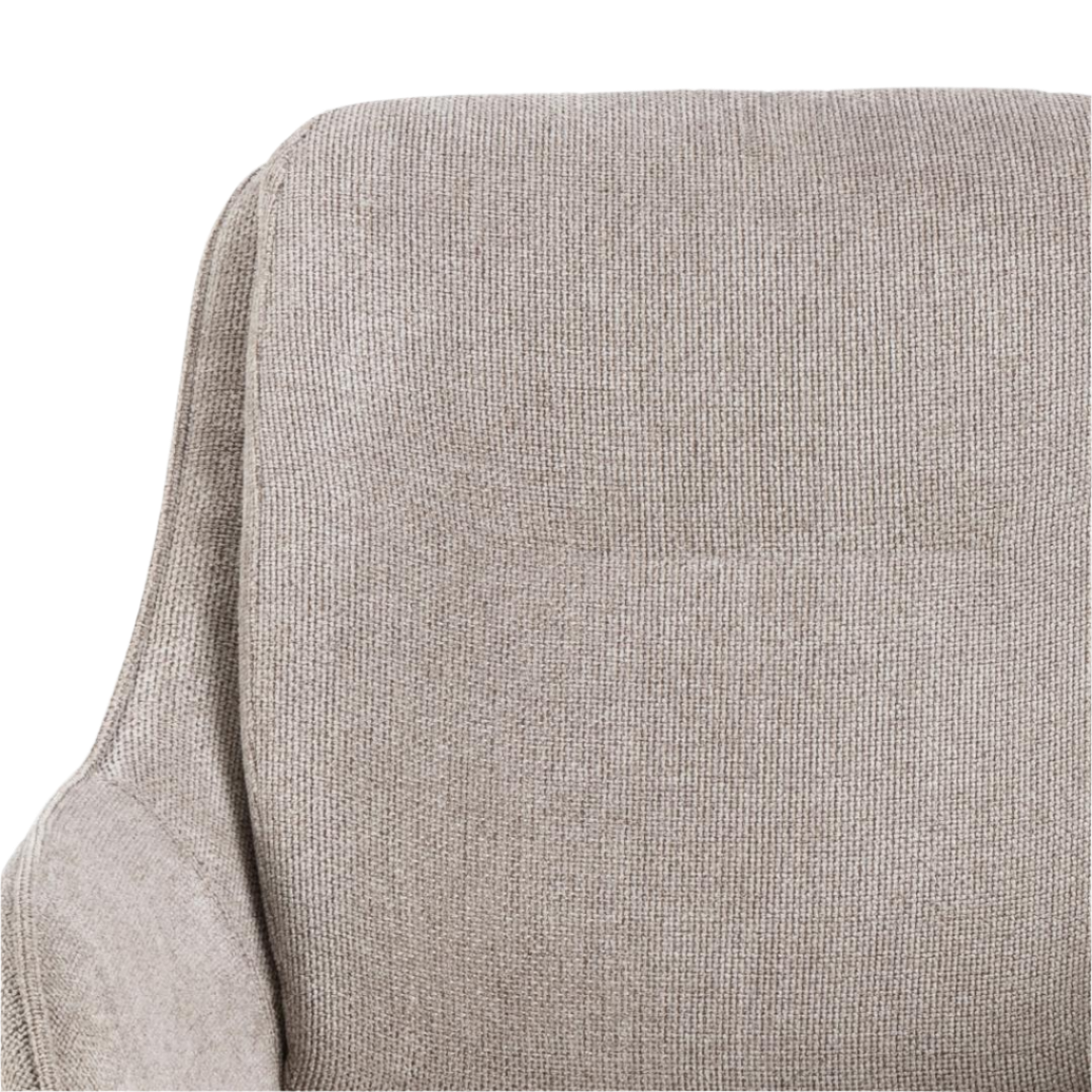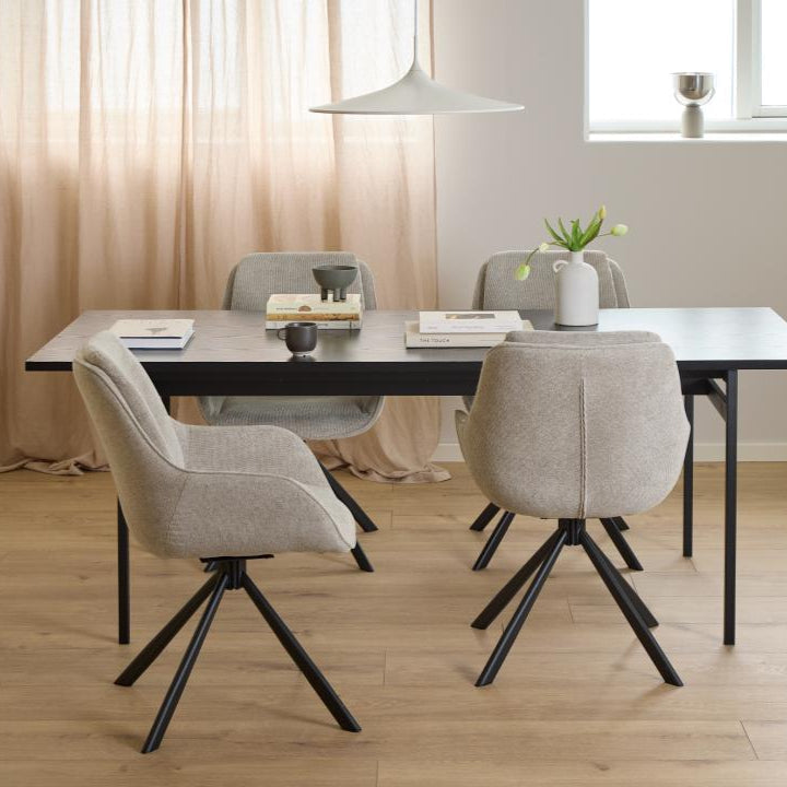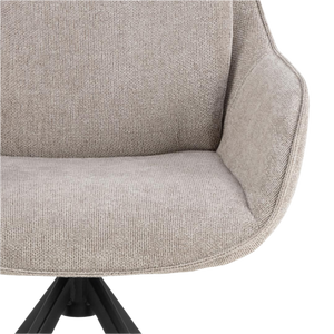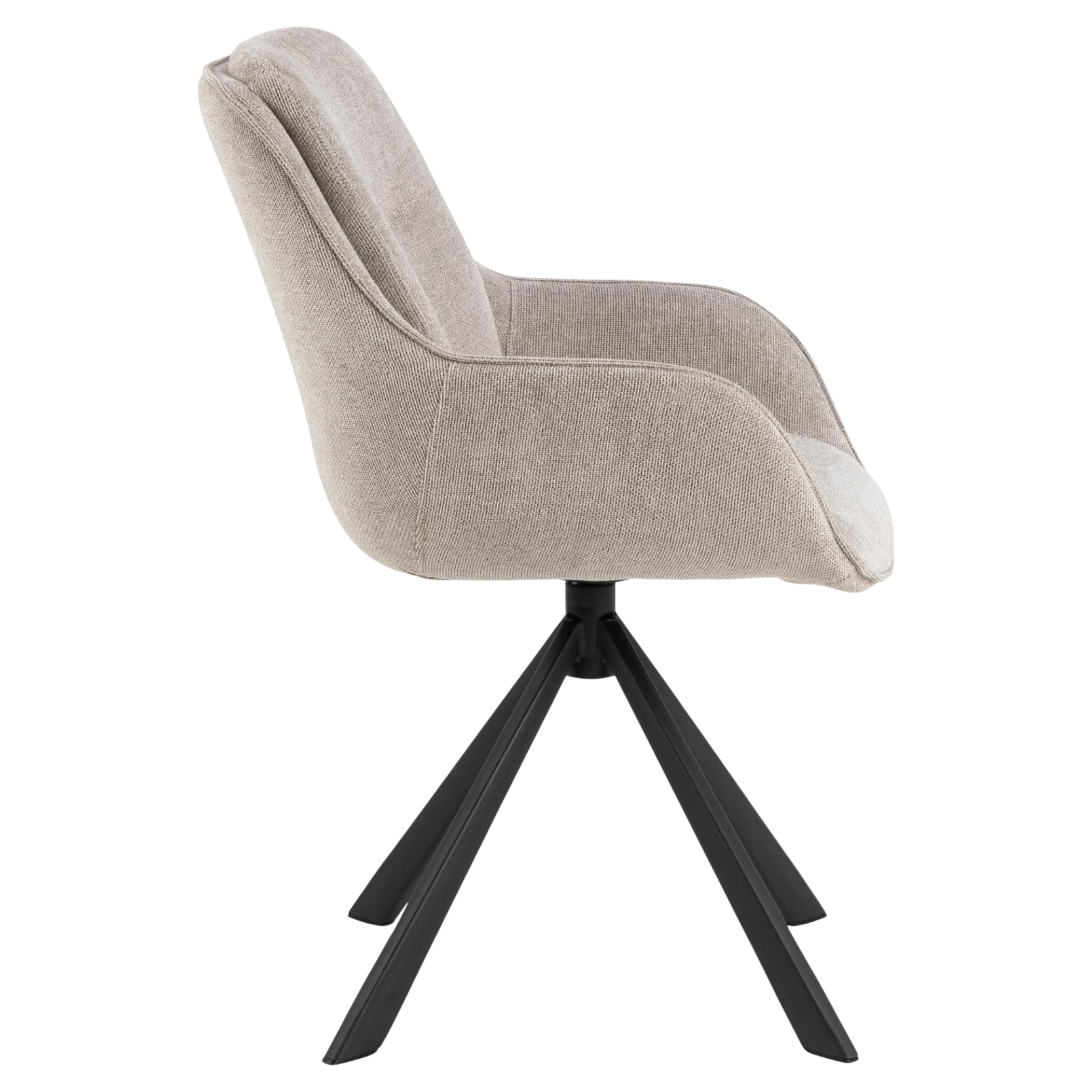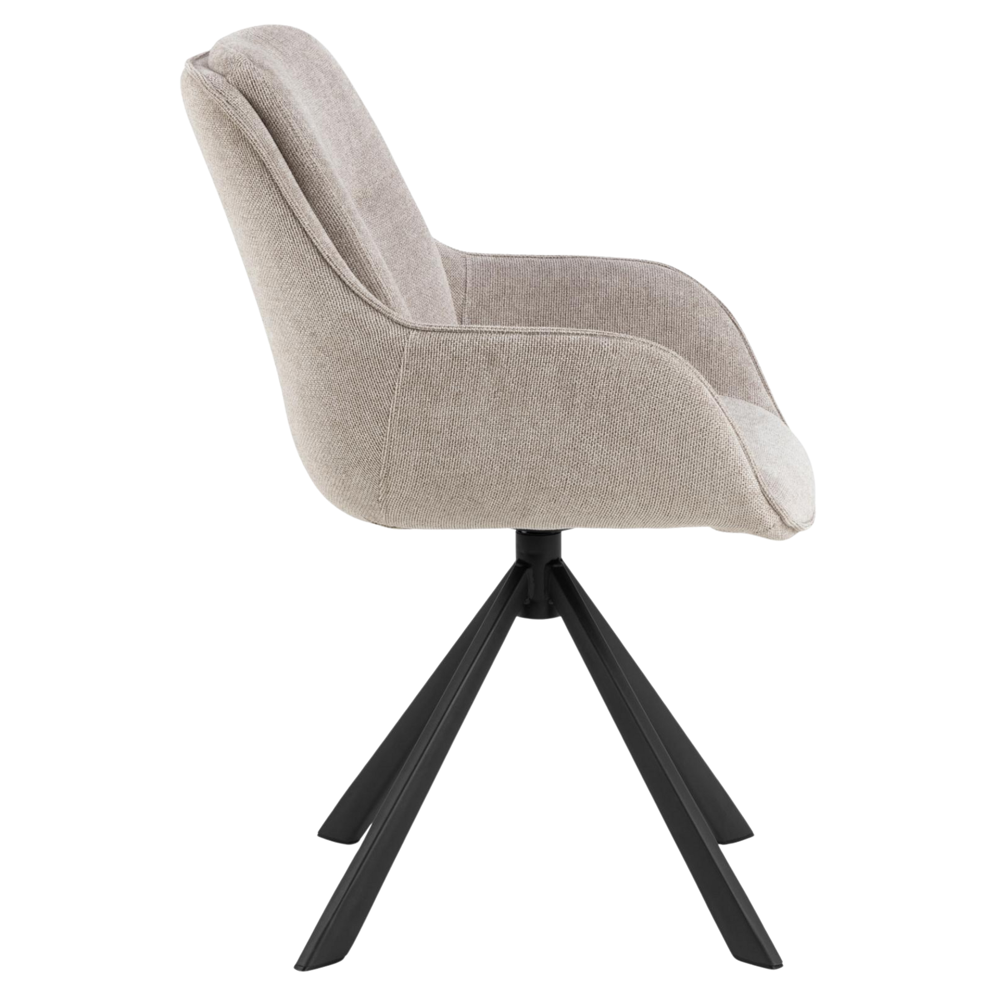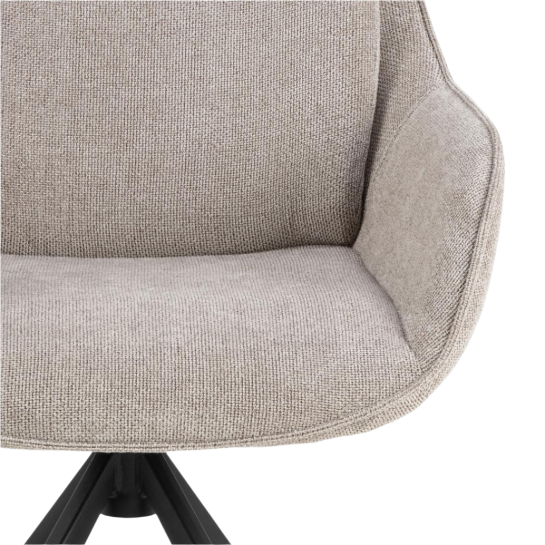 Upholstered in soft, low-maintenance fabric that preserves its appearance and tactile quality through intensive daily use, this chair features a complete 360-degree swivel mechanism for effortless repositioning and a minimalist black steel base that anchors modern interiors with structural integrity.