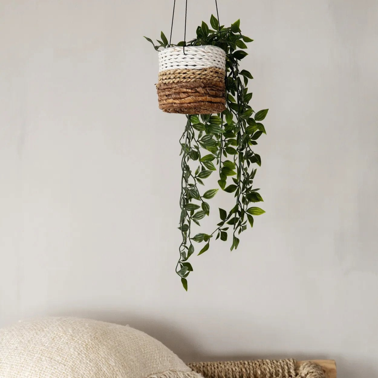 The SURI planter elevates your greenery with refined natural aesthetics and responsible craftsmanship. Meticulously hand-woven from banana leaf and seagrass, this suspended planter introduces organic warmth and textural depth to residential and covered outdoor environments.