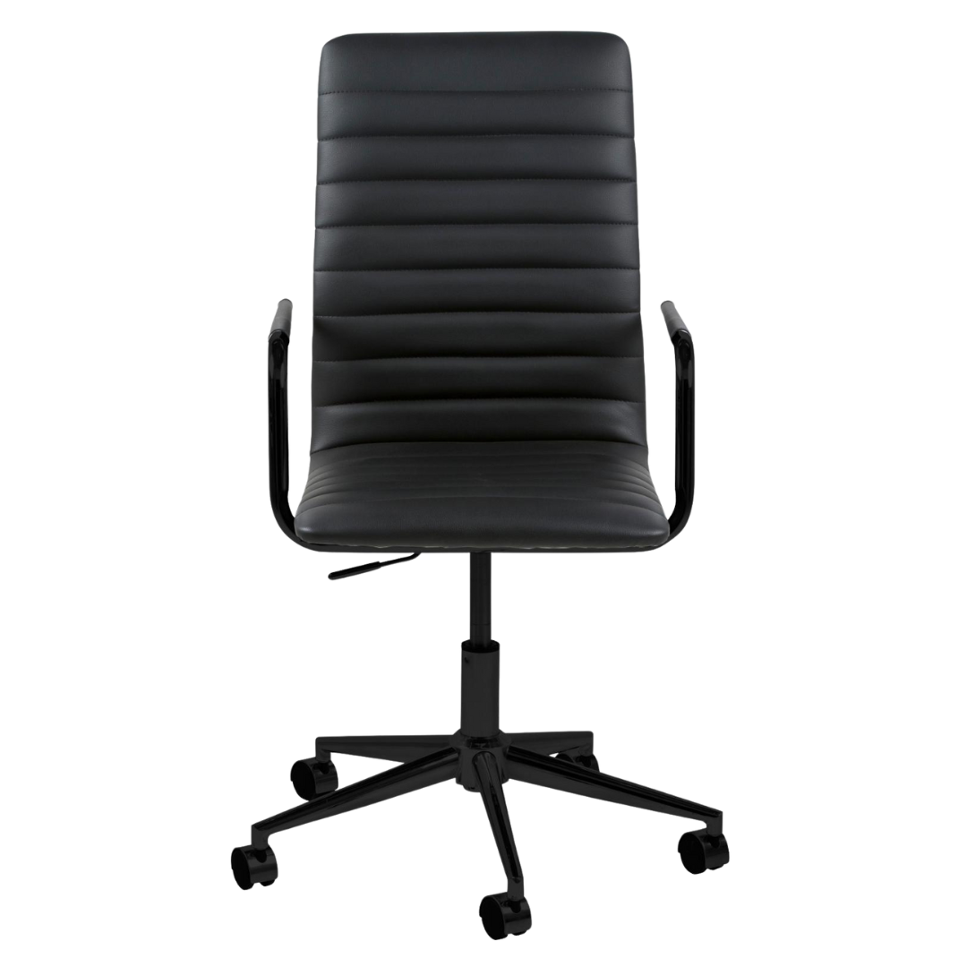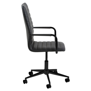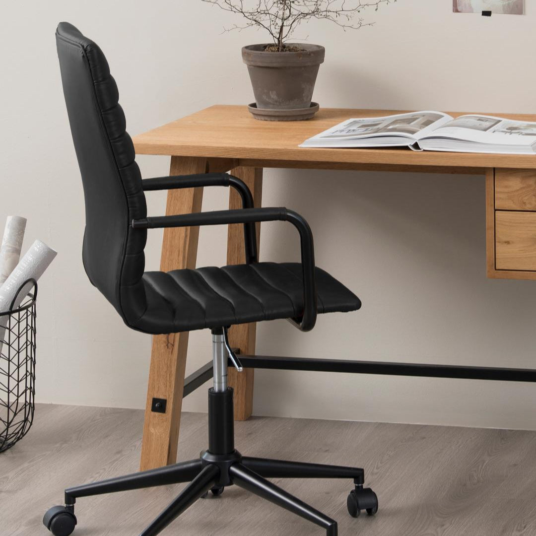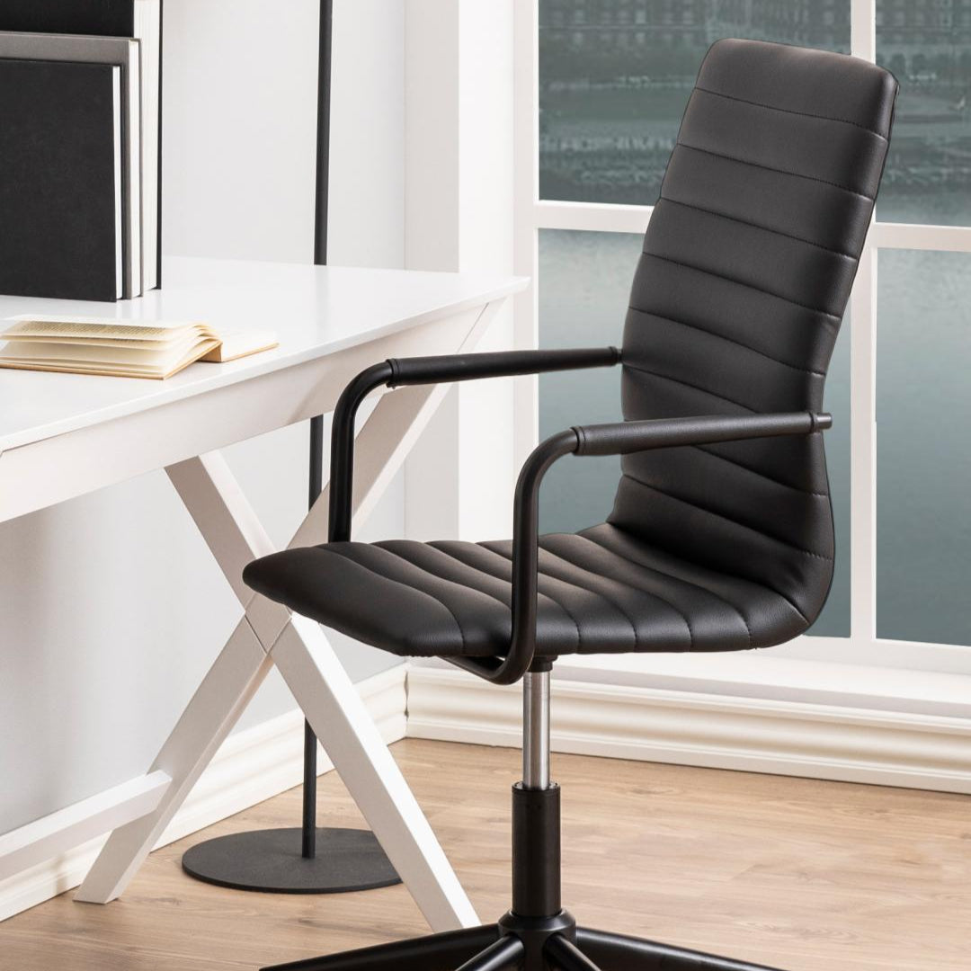 The YARA office chair delivers commanding presence through its extended backrest and refined proportions, establishing a professional seating solution with distinctive character. Upholstered in premium black synthetic leather with horizontal stitching detailing, it projects executive sophistication across contemporary workspaces.